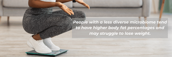 Außerdem werden bestimmte Arten von Darmbakterien mit Fettleibigkeit und Gewichtszunahme in Verbindung gebracht. Studien haben gezeigt, dass Menschen mit einem weniger vielfältigen Mikrobiom zu einem höheren Körperfettanteil neigen und Schwierigkeiten beim Abnehmen haben können. Das liegt daran, dass die Darmbakterien die Art und Weise beeinflussen können, wie unser Körper Fett aufnimmt und speichert.